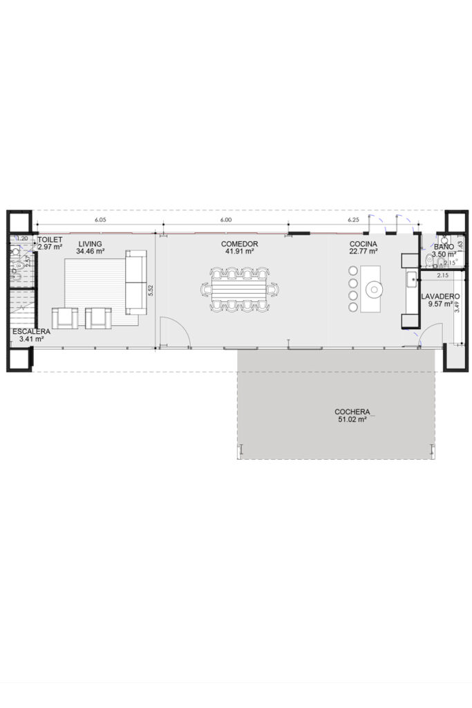 Interior abierto y fluido, con la menor cantidad de particiones posibles, permitiendo una circulación natural de luz, aire y personas.